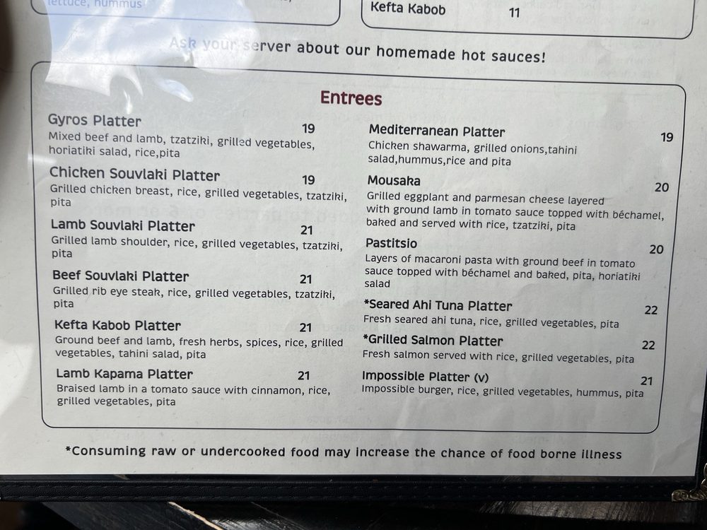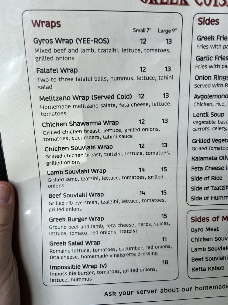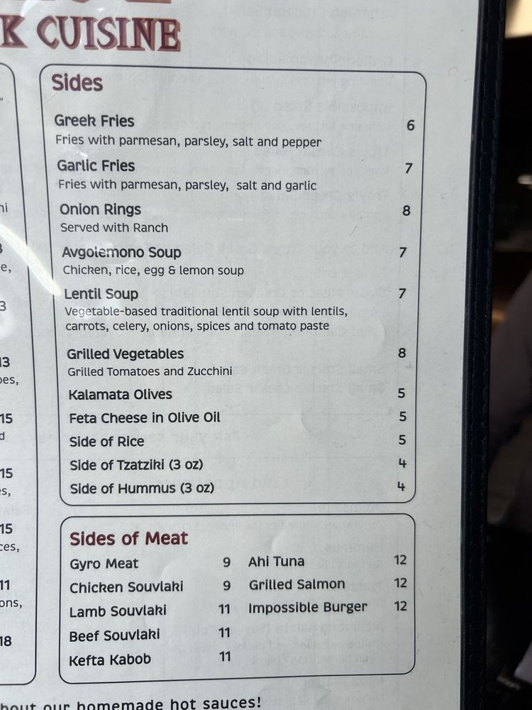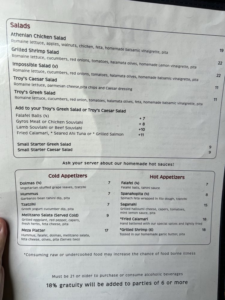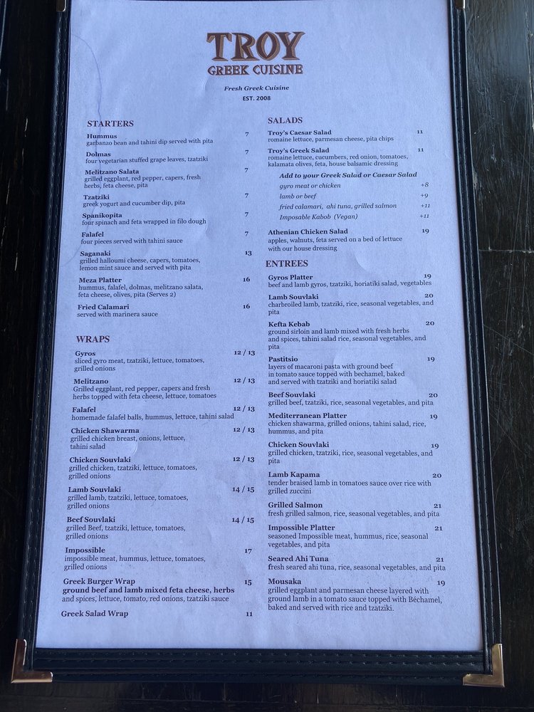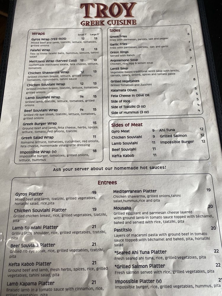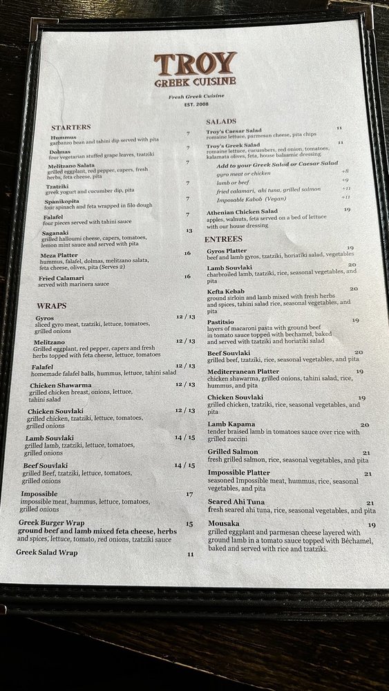 Salads like the Troy's Greek Salad and Athenian Chicken Salad provide a fresh touch, while hearty wraps such as the Gyros Wrap and Impossible Wrap promise satisfying bites for both meat lovers and vegans alike. Whether indulging in a casual lunch or a family dinner, the inviting atmosphere, complemented by outdoor seating and vibrant flavors, makes for a truly memorable dining experience.