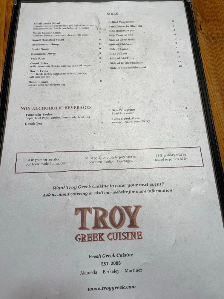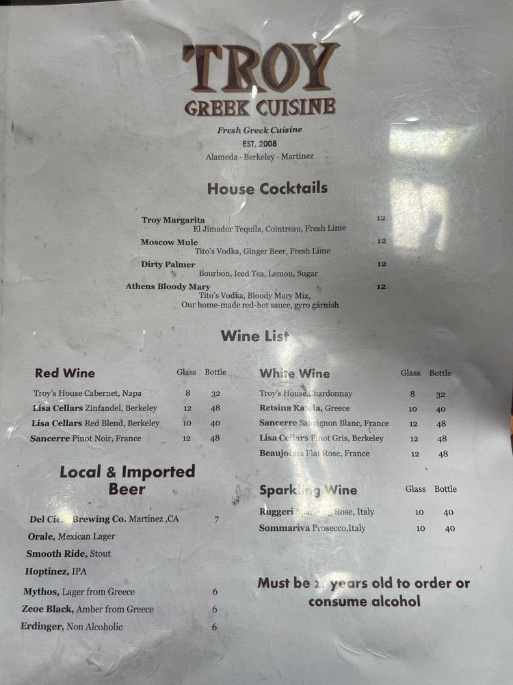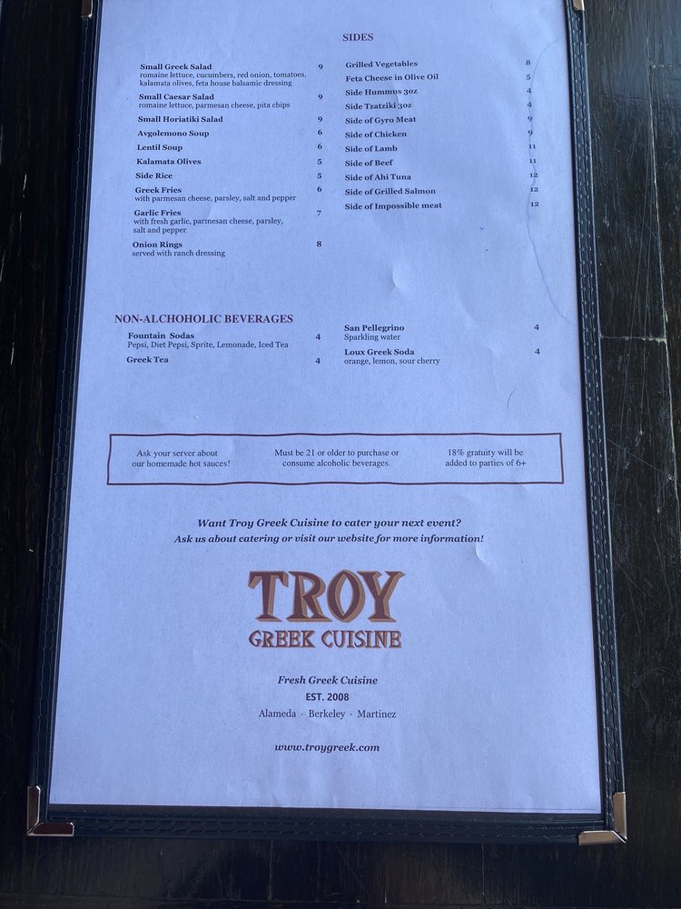 Welcome to Troy Greek Cuisine, where the heart of Greek and Mediterranean flavors comes alive in every dish. Nestled in Berkeley, California, this charming restaurant offers a diverse menu that caters to a variety of palates. Start your culinary journey with irresistible meza starters featuring Hummus, Saganaki, and the delightful Fried Calamari.